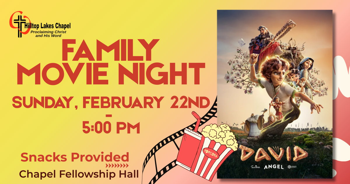 Join us for family movie night. We will be showing David--Bold, cinematic, and deeply faith-centered, DAVID brings the biblical story to life for all generations. Currently the #1 family movie in the country, the film is resonating with audiences through its powerful message of faith, courage, and trusting God against impossible odds.